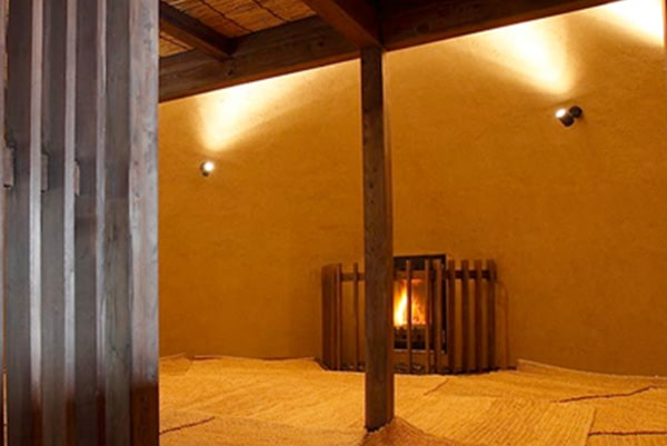 寝湯に、壺湯に、火を眺めボーっとする場所も。